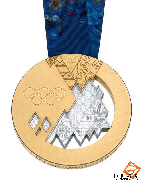 奖牌主体分两部分,一边为体现金银铜奖牌属性的实心部分,另一边为银白色的镂空镶嵌设计。奖牌上绘有索契风光,太阳的金色阳光透过白雪皑皑的雪山之巅折射到黑海之滨的松软沙滩上五彩斑斓,花纹繁复但细节处又不失精致。