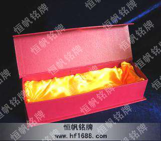 硬纸质材料,内有红色(也可为金黄色)绒布内衬,外面配古铜锁扣,或各种色彩彩条系住,表面为各色布纹,高档。常适用于高贵奖牌、工艺品的首选锦盒。