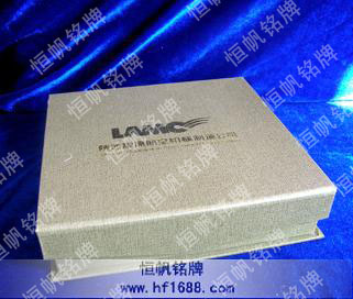 硬纸质材料,内有红色(也可为金黄色)绒布内衬,外面配古铜锁扣,或各种色彩彩条系住,表面为各色布纹,高档。常适用于高贵奖牌、工艺品的首选锦盒。